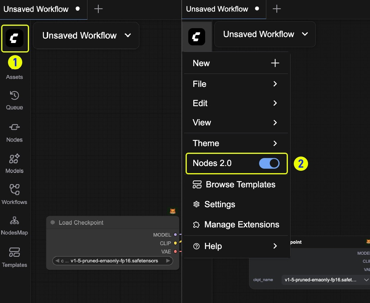 You can always switch back: click the ComfyUI logo to open the menu, then toggle “Nodes 2.0” to switch back.