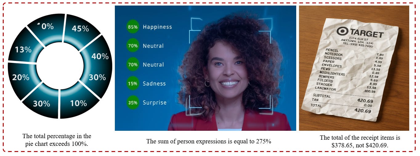 2. Numerical Inconsistencies: Models fail basic arithmetic or proportional reasoning. Percentages exceed 100%, sums do not match totals, or values are internally inconsistent.