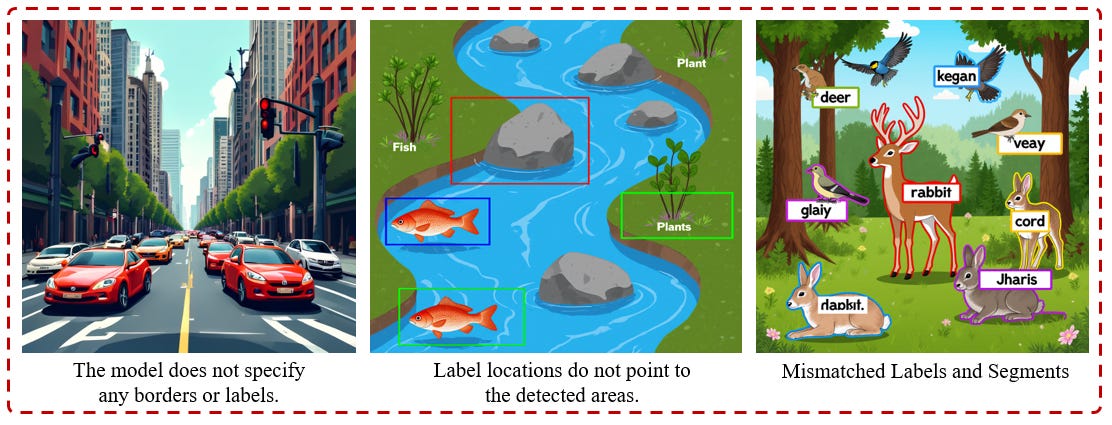 3. Segments and Labeling Issues: models assign incorrect labels, misplace bounding boxes, or fail to align semantic segments with their intended regions.