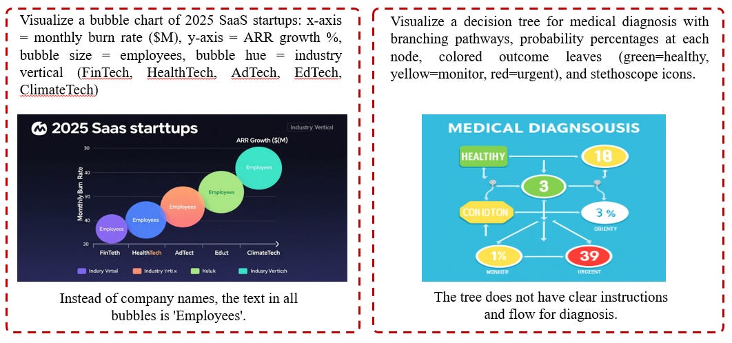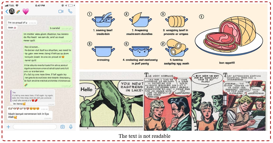 6. Unreadable Text : Models frequently fail on text-rich scenes such as screenshots, comics, or infographics. Generated text becomes garbled, misaligned, or unreadable.