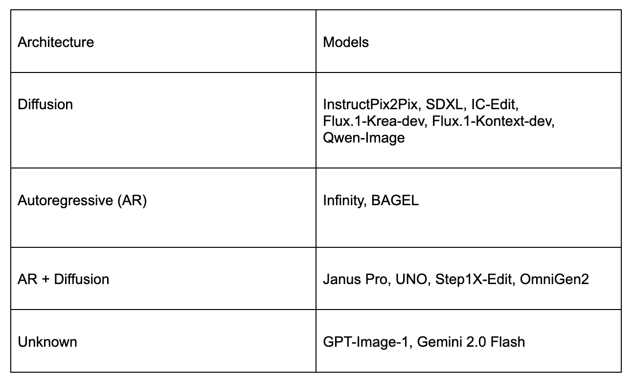Together, these models cover the landscape of modern generative architectures: from diffusion model to emerging autoregressive-diffusion hybrids that unify generation and editing within a single multimodal framework.