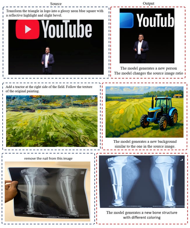 4. Generating New Image in Editing: Models asked to make small edits often regenerate an entirely new image or ignore the source content.