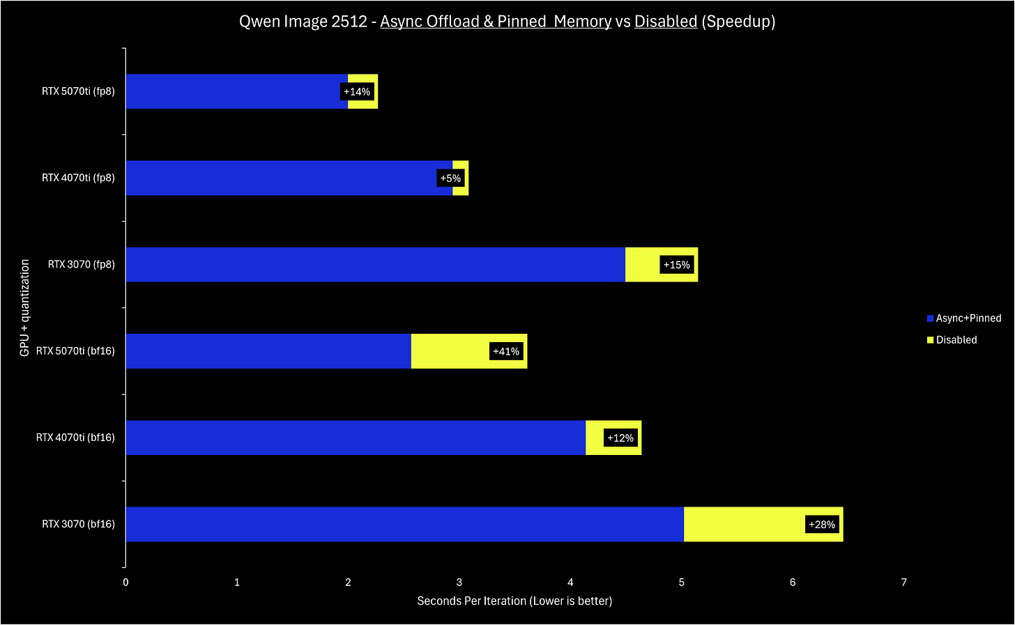 To sum up the tech details, async offloading and pinned memory make offloading weights have a smaller performance penalty than before - this means that in any scenario where a model’s weights cannot fully fit on the VRAM of a card, performance now should be improved. Note the implication: if you do not need to offload any weights to run a model, these optimizations will not improve your performance in a meaningful way.