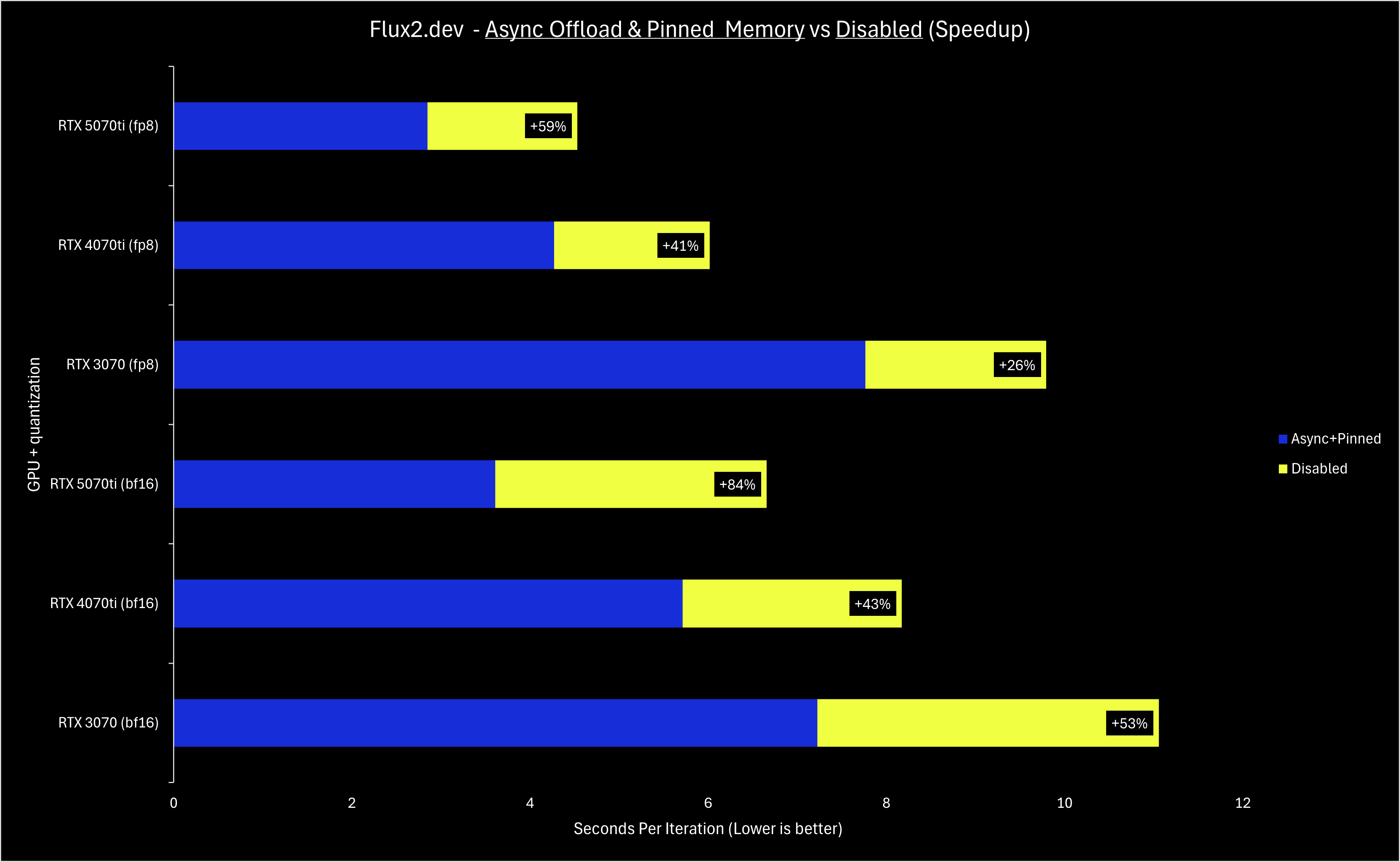Unlike NVFP4, async offloading and pinned memory are broadly applicable to all NVIDIA GPUs, so they have been enabled by default in December. Depending on your hardware and the specific model used in a workflow, your sampling speed may have improved 10-50% compared to having these features disabled.