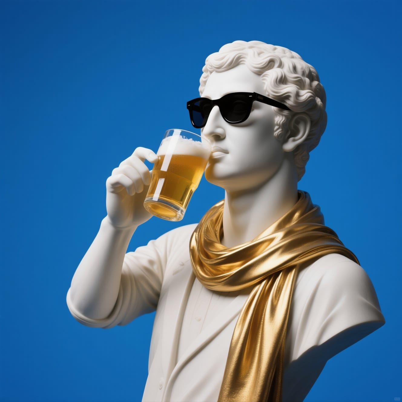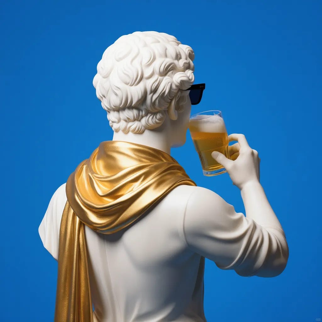 Prompt: Change the perspective to view the scene of the statue drinking beer from behind. Note that one of the statue's arms is missing.