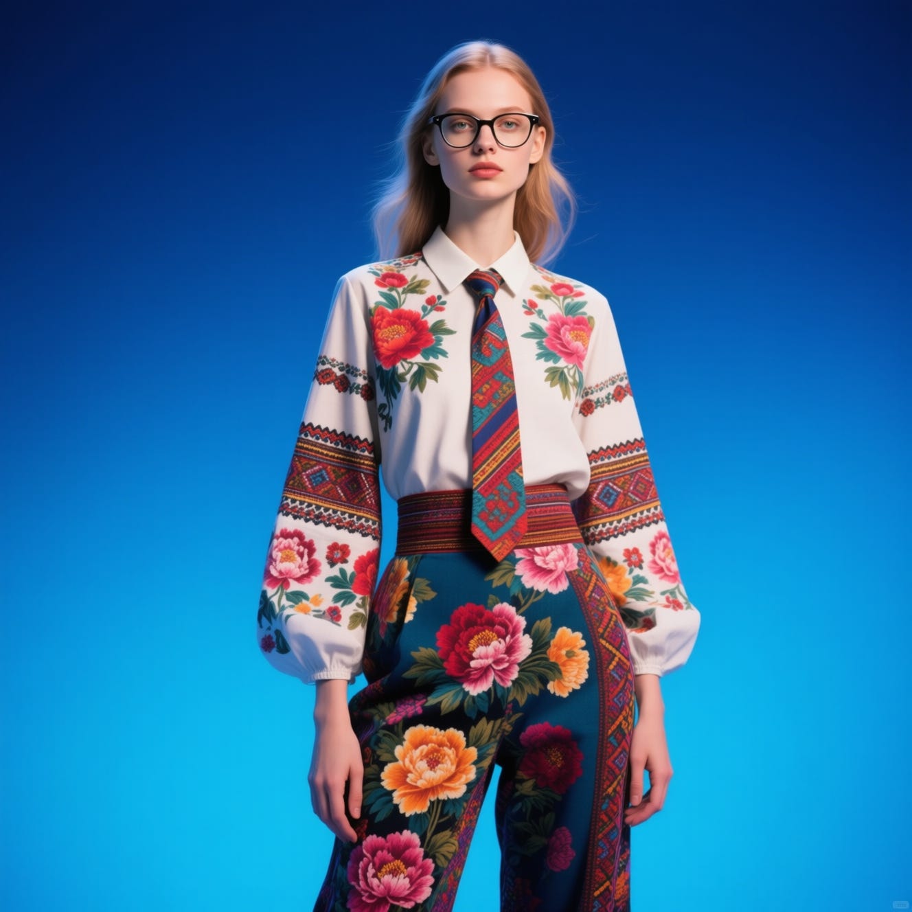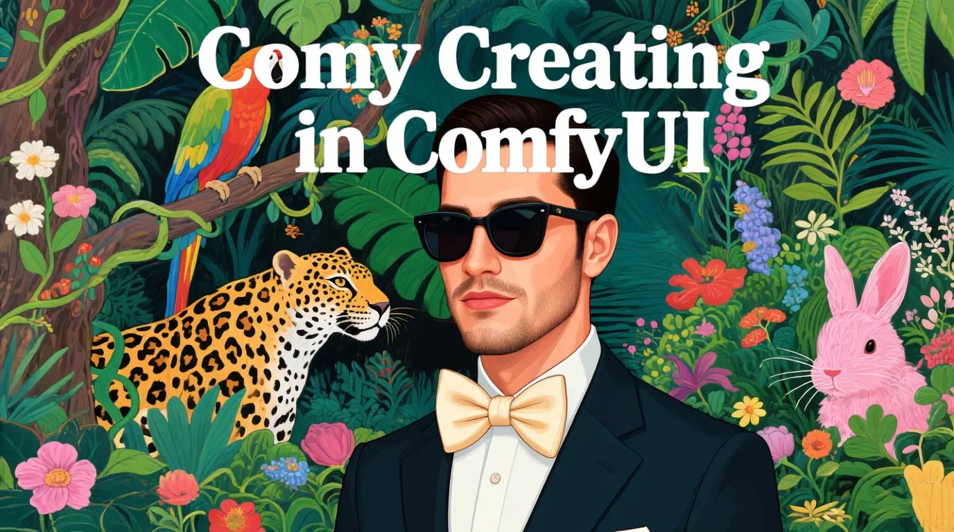 Change the character to a male one. He should also be fashionable and wear sunglasses. Add the text 'Comfy Creating in ComfyUI' at the top of the image. Pay attention to the capitalization of the text. The character should not block the text.