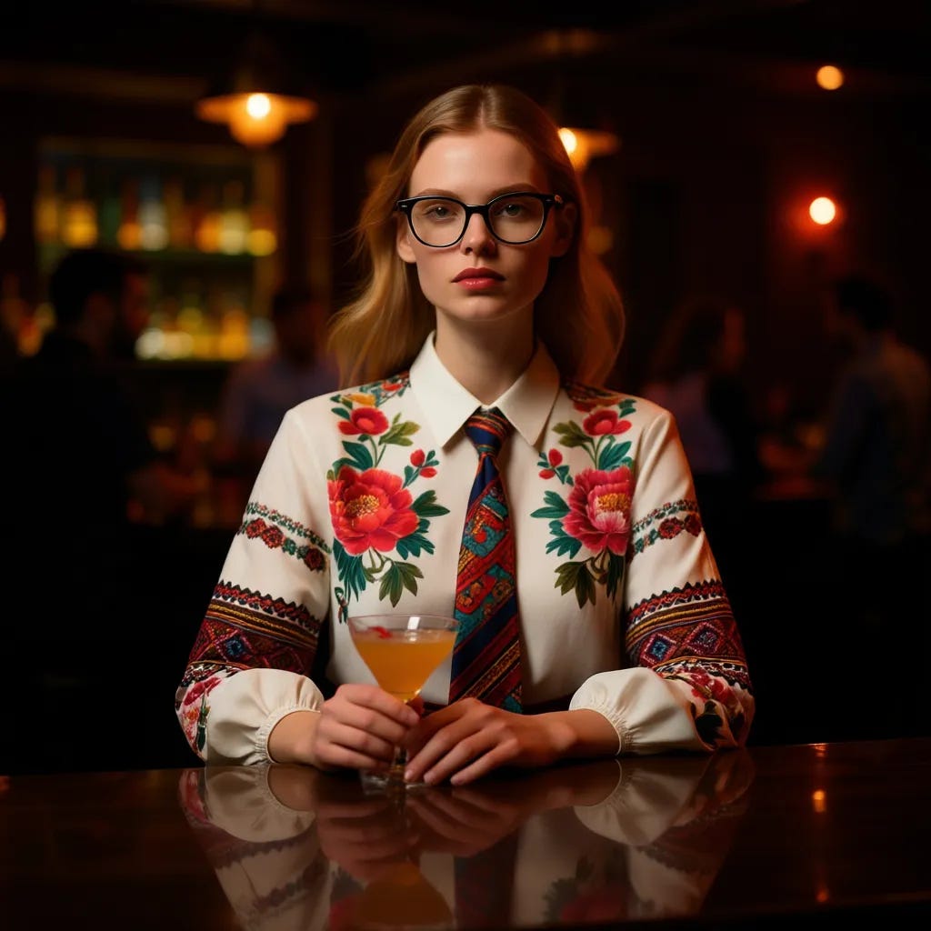 Prompt: Have the character seated at the bar of a busy pub. Behind her, the scene is lively, but the background stays mostly dark. She’s holding a wine glass, facing the bar, with the light lighting up the foreground—giving the whole image a cinematic look and feel.