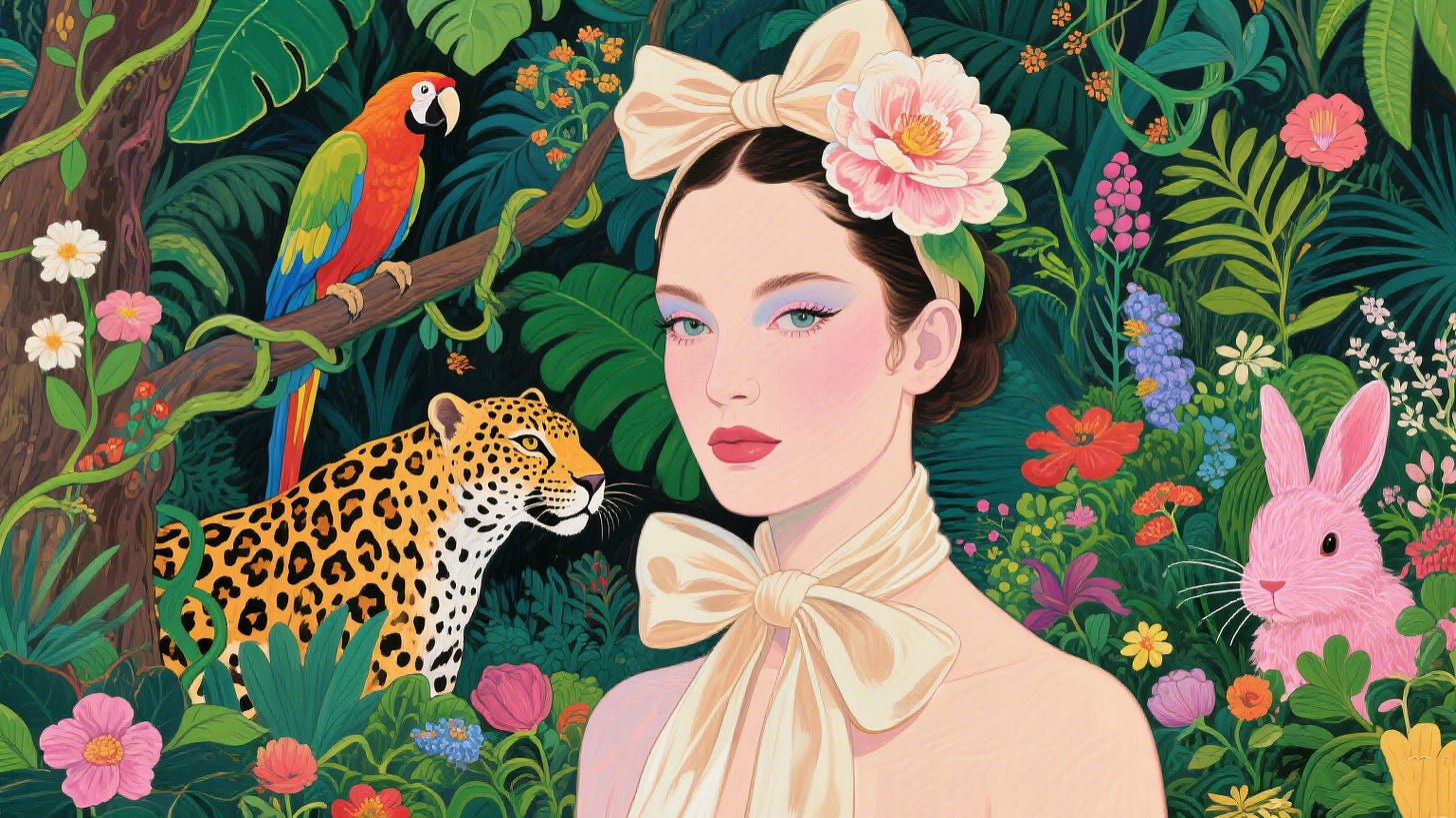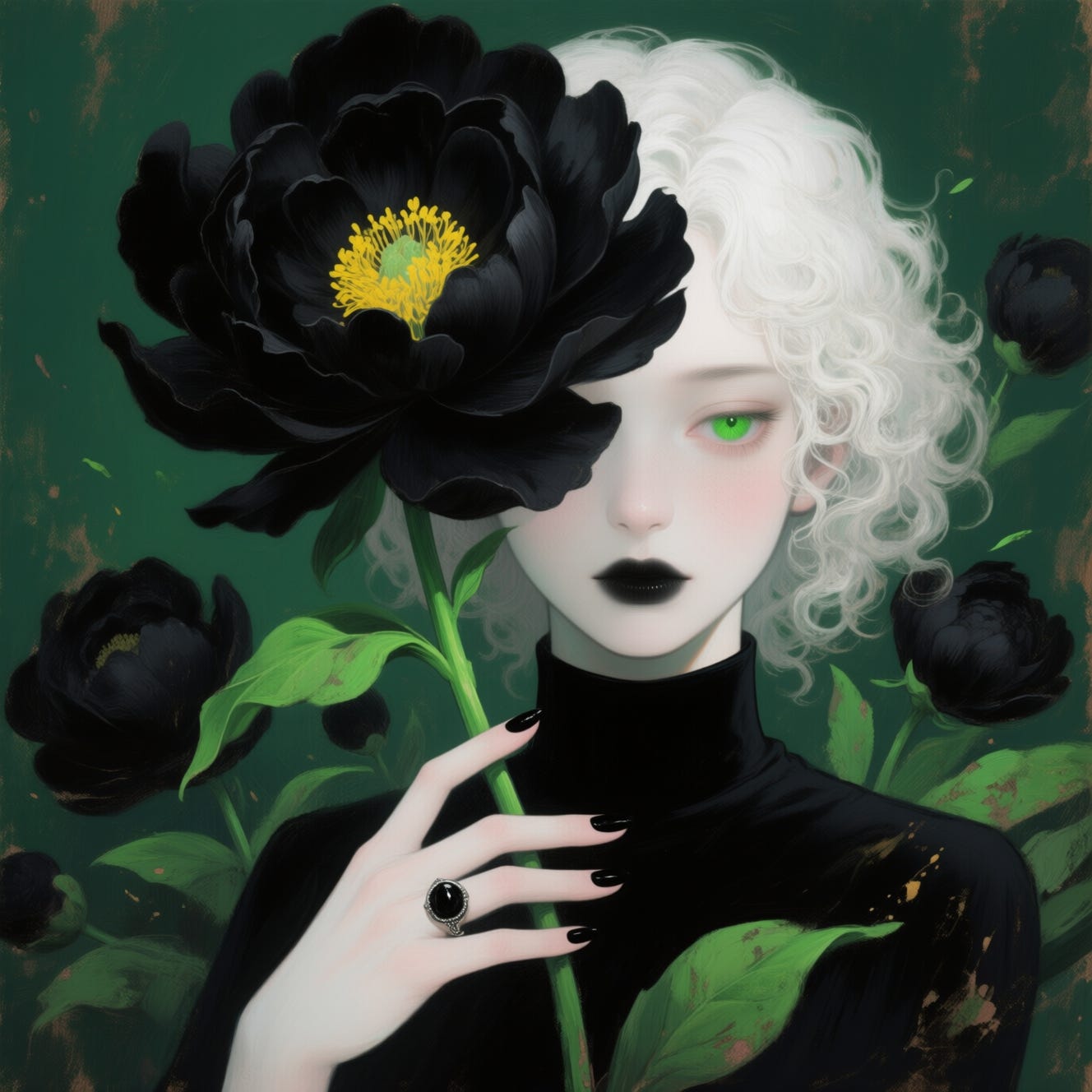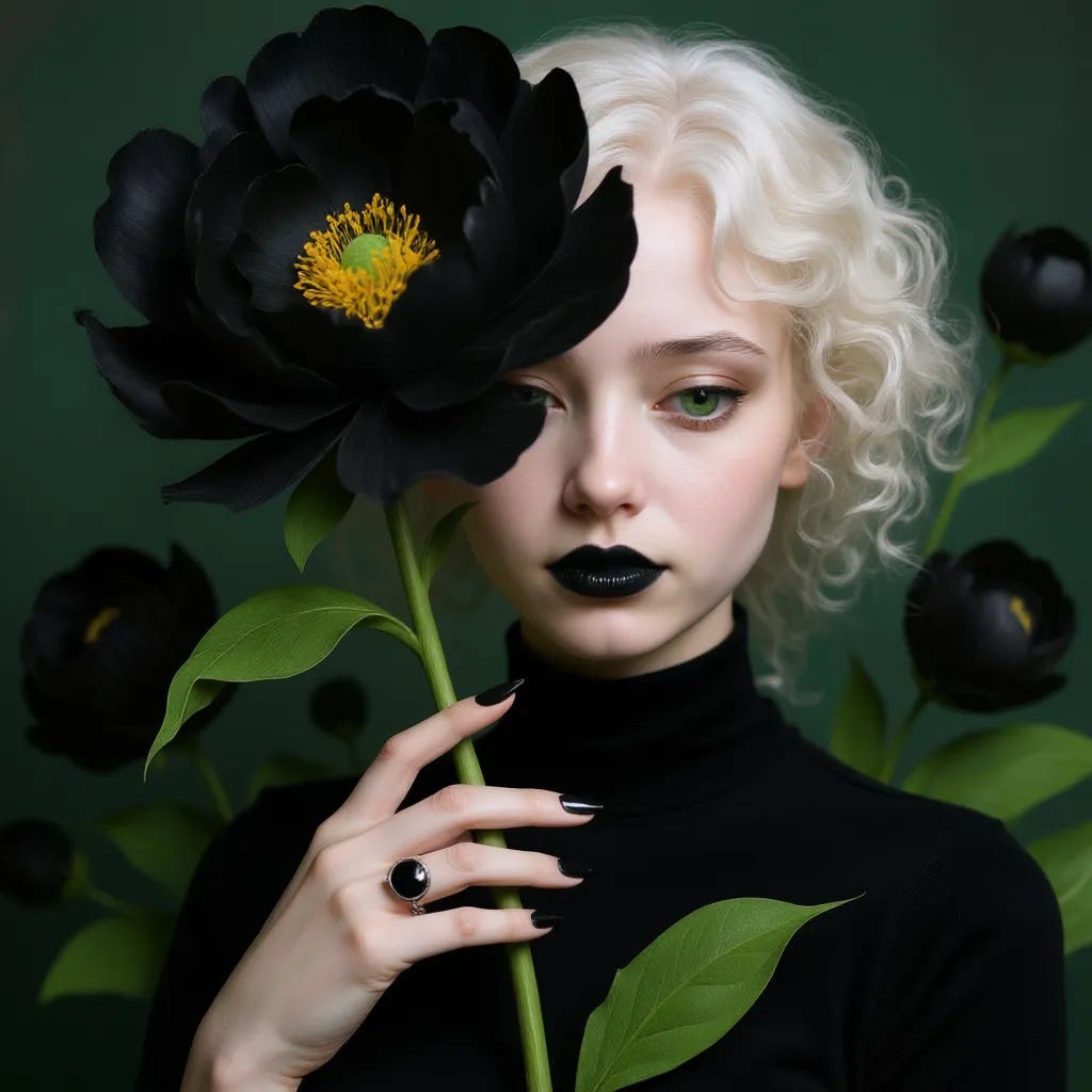 Prompt: Turn this illustration into a realistic portrait photography style. Use young characters, and keep their green eye color and black lipstick. The characters have snow-white skin, with their eyelids slightly drooping and their eyes looking a little forward, showing an elegant and quiet expression.