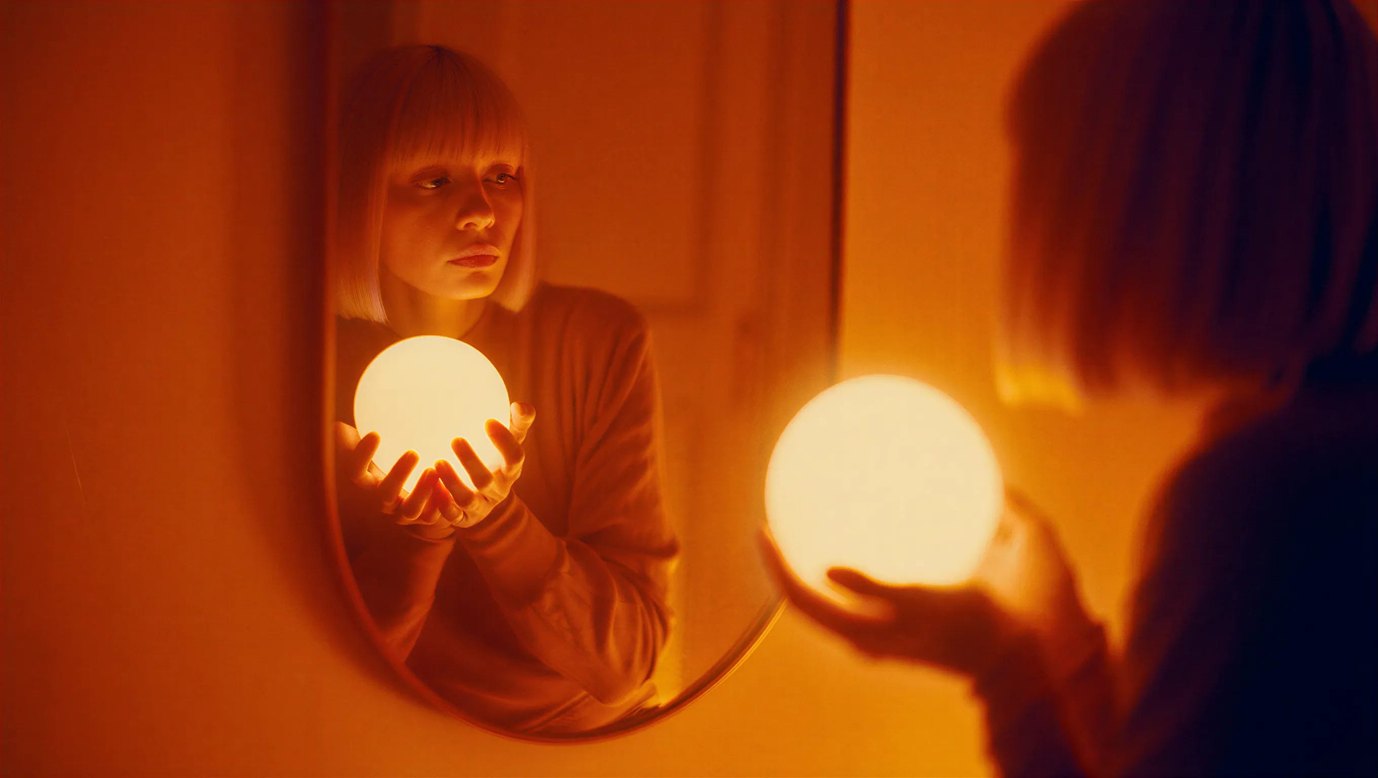 A cinematic photograph of a woman with a bob haircut looking at her reflection in a mirror, her hands gently cradling a brilliant, glowing spherical white orb. The image is saturated in deep orange and amber tones, with heavy light leaks and lens flares washing out the center of the frame as the sphere radiates subtle, ethereal light. The composition features a soft, dreamy focus with significant analog film grain, creating a nostalgic atmosphere where the reflected face in the mirror appears slightly blurred and obscured by the warmth of the light leakage