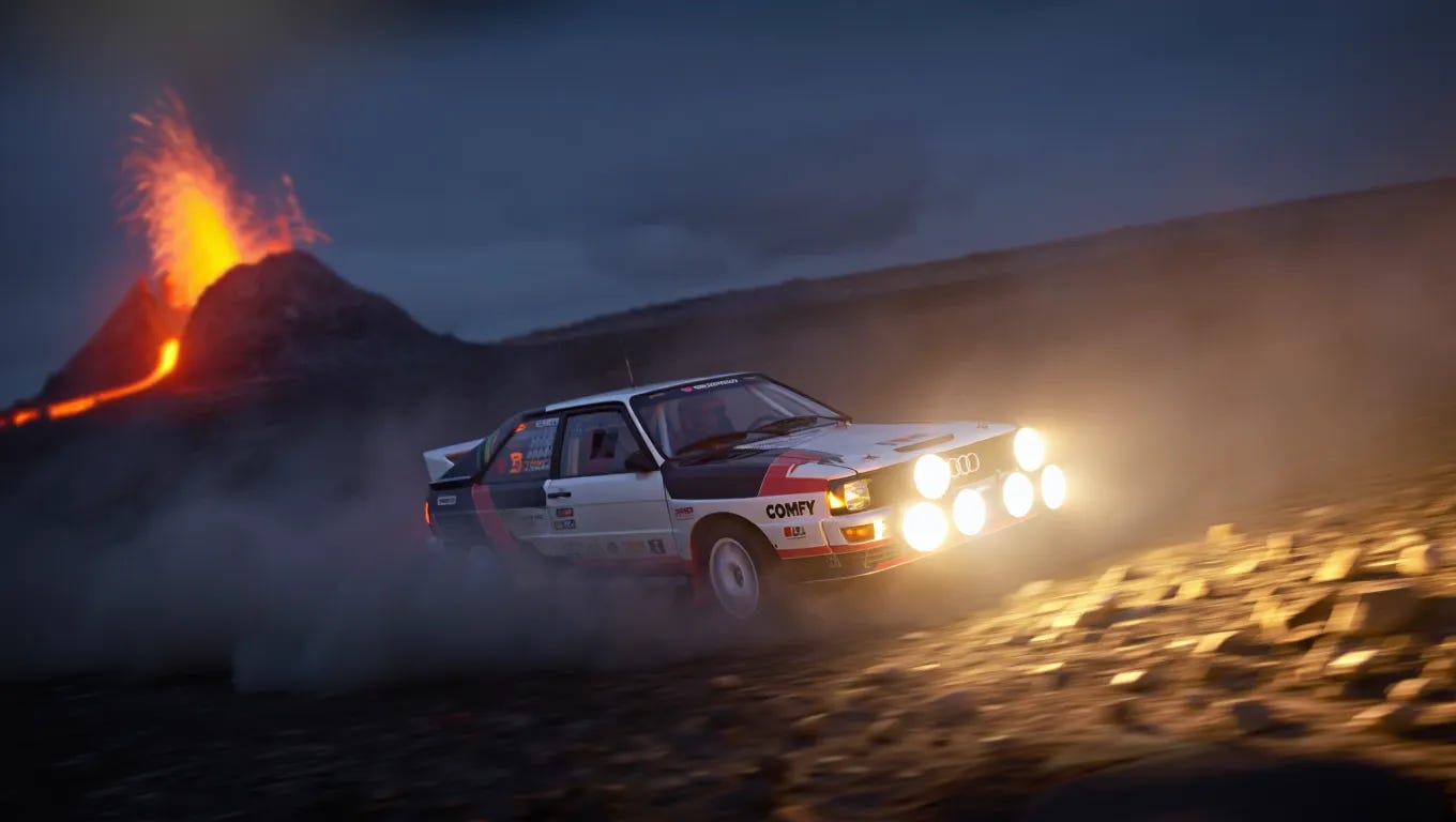 A high-action, wide-angle nighttime shot of a legendary Audi Quattro rally car drifting through a baron rocky field at the base of a volcano. The car is coated in a white and black. Powerful auxiliary spotlights on the front of the car cast a bright, warm glow, catching the thick dust kicked up by the aggressive tread of the tires. In the background, out-of-focus volcano spraying lava. The scene is cold and dark, with the intense light from the lava creating dramatic contrast.