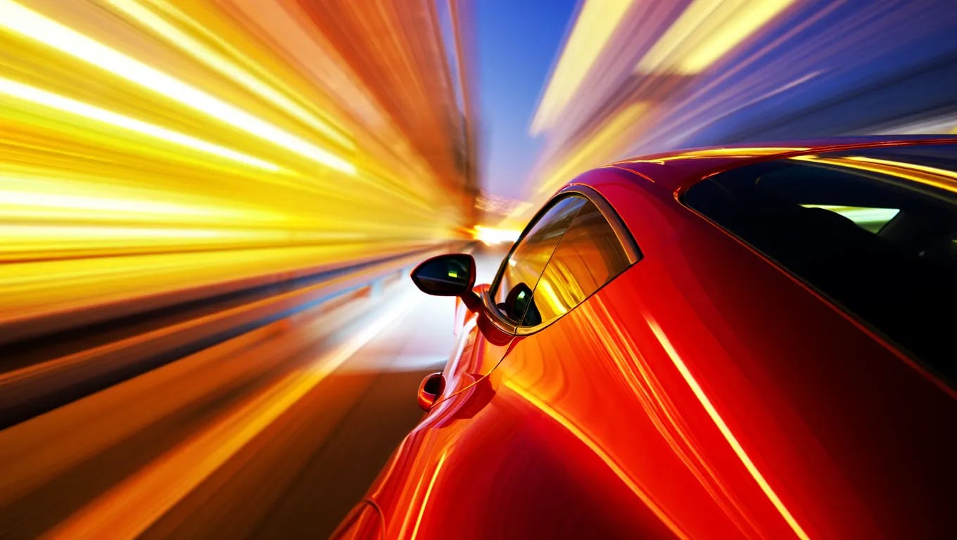 A high-speed, cinematic capture of a vibrant red sports car speeding through the night. The camera angle is positioned near the rear-three-quarter view, emphasizing the sleek, metallic curves and the car’s aerodynamic design. The entire background is transformed into a dramatic radial blur of brilliant yellow, orange, and white light streaks, suggesting extreme velocity. The car’s surface reflects the warm ambient lights of the city, contrasting sharply with the deep, dark blue of the night sky.