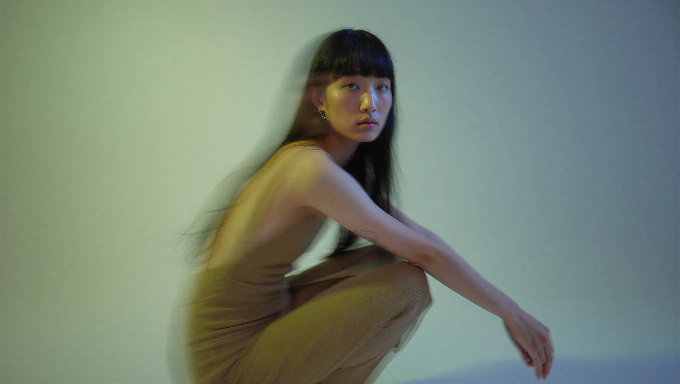 A high-fashion editorial portrait of a young East Asian model with long, straight black hair and thick bangs, crouched in a studio setting. She wears a minimalist, muted beige dress. The image features a cinematic dual-tone lighting setup, where the left side is washed in a soft greenish-yellow glow and the right side is cast in cool, muted blue-grey, creating a subtle color bleed effect. There is a slight motion blur, with the subject looking directly at the camera with a calm, neutral expression. High-end fashion magazine aesthetic, soft focus background, structured silhouette.