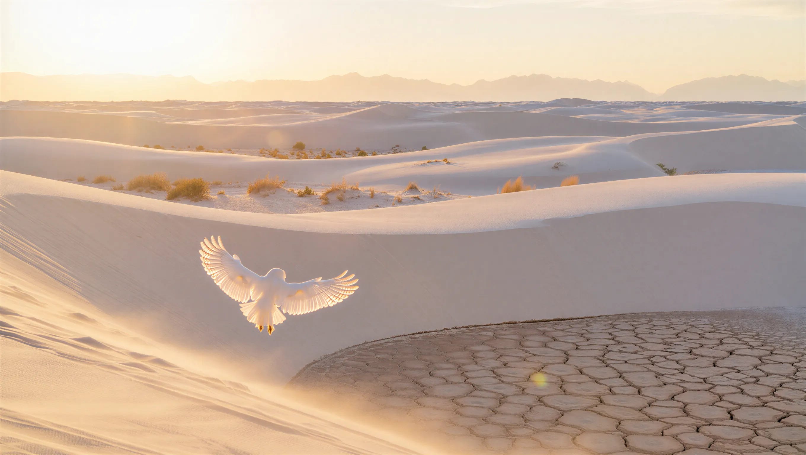 A minimalist wide shot of a vast white sand dune desert during golden hour. A White Owl with it’s wings spread is in the foreground. A soft warm sunlight grazing the tops of the dunes, casting long shadows. Sparse, golden-brown desert shrubs are scattered across the ripples, with a prominent patch of dry, cracked, hexagonal mud in the bottom right foreground. In the far distance, a hazy, ethereal range of mountains rests against a pale, washed-out sky.