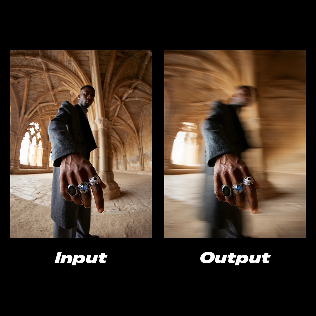 Add a cinematic horizontal streaks motion blur to the subject’s body. The hand stays in clear in focus.