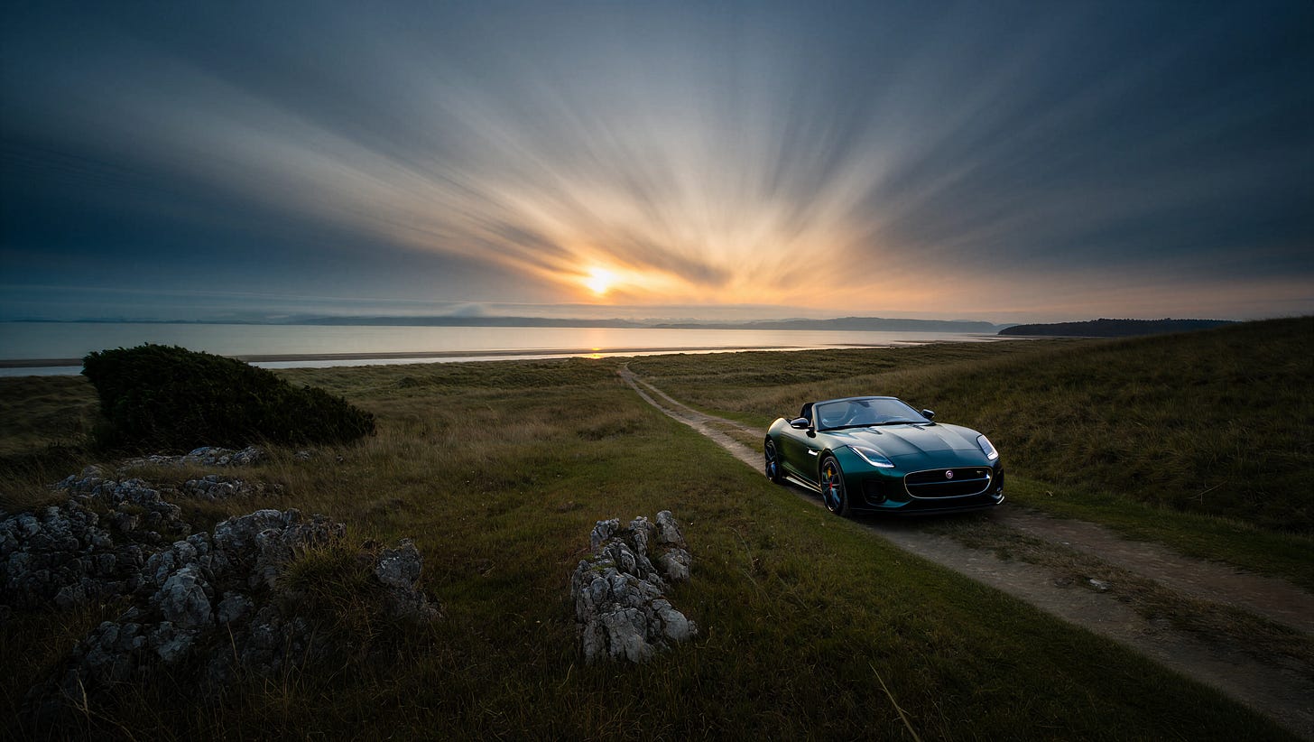 A wide-angle landscape photograph of a solitary Jaguar F-Type car in a British green, the car is on a dirt trail, facing a distant beach at twilight. The sky features dramatic long-exposure cloud streaks radiating from a low sun on the horizon. The foreground is dominated by jagged limestone rocks and blades of grass, leading the viewer’s eye along a path that cuts through grassy hills toward the water. The lighting is cool and moody, casting deep shadows against the golden glow of the setting sun, with a small, dark bush to the left of the path.