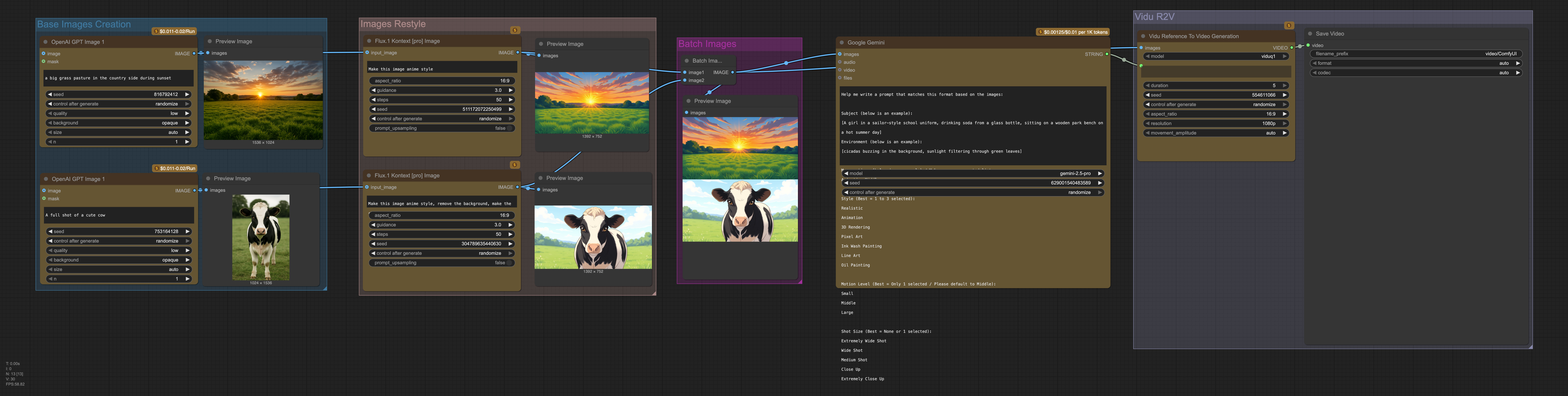 Using OpenAI Image Generation for Subject & Background → Kontext Stylization → Gemini Node for Prompt Engineering → Vidu Reference-to-Video Node for video generation.
