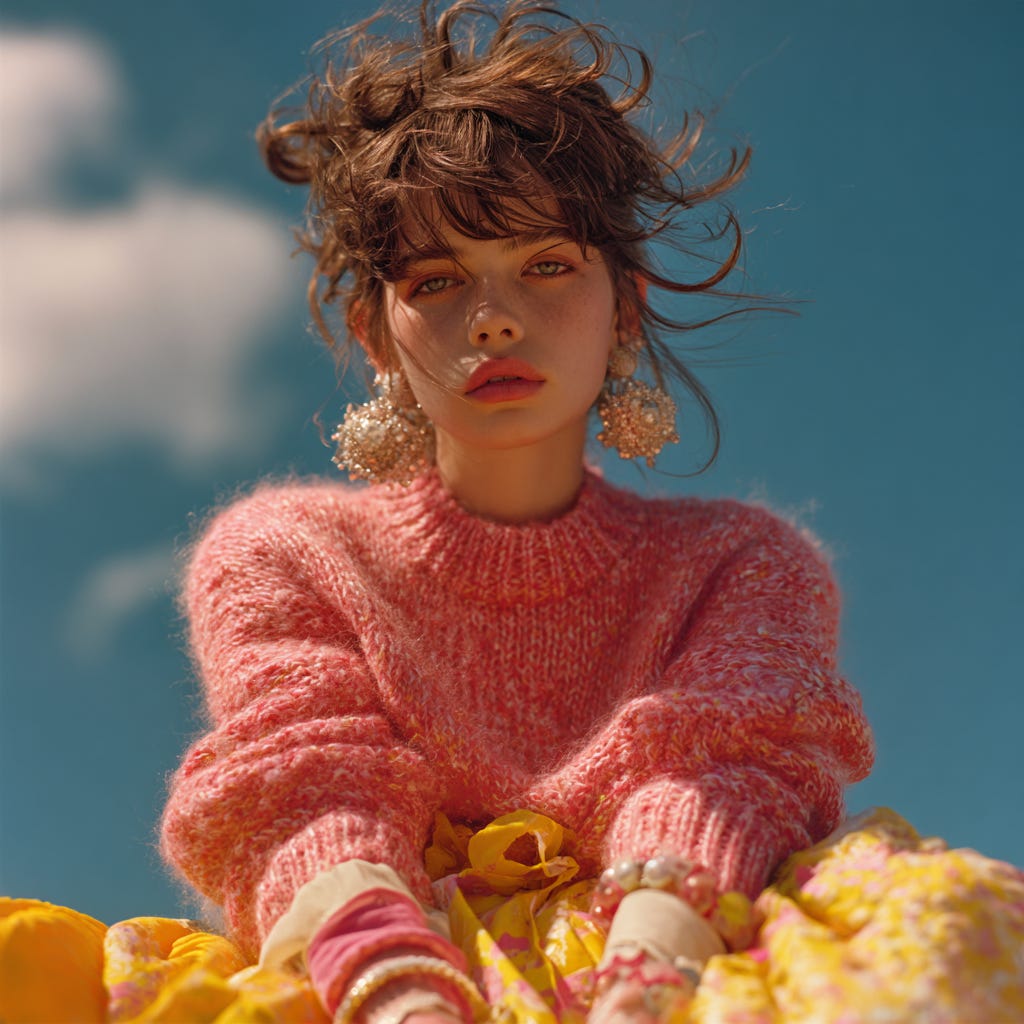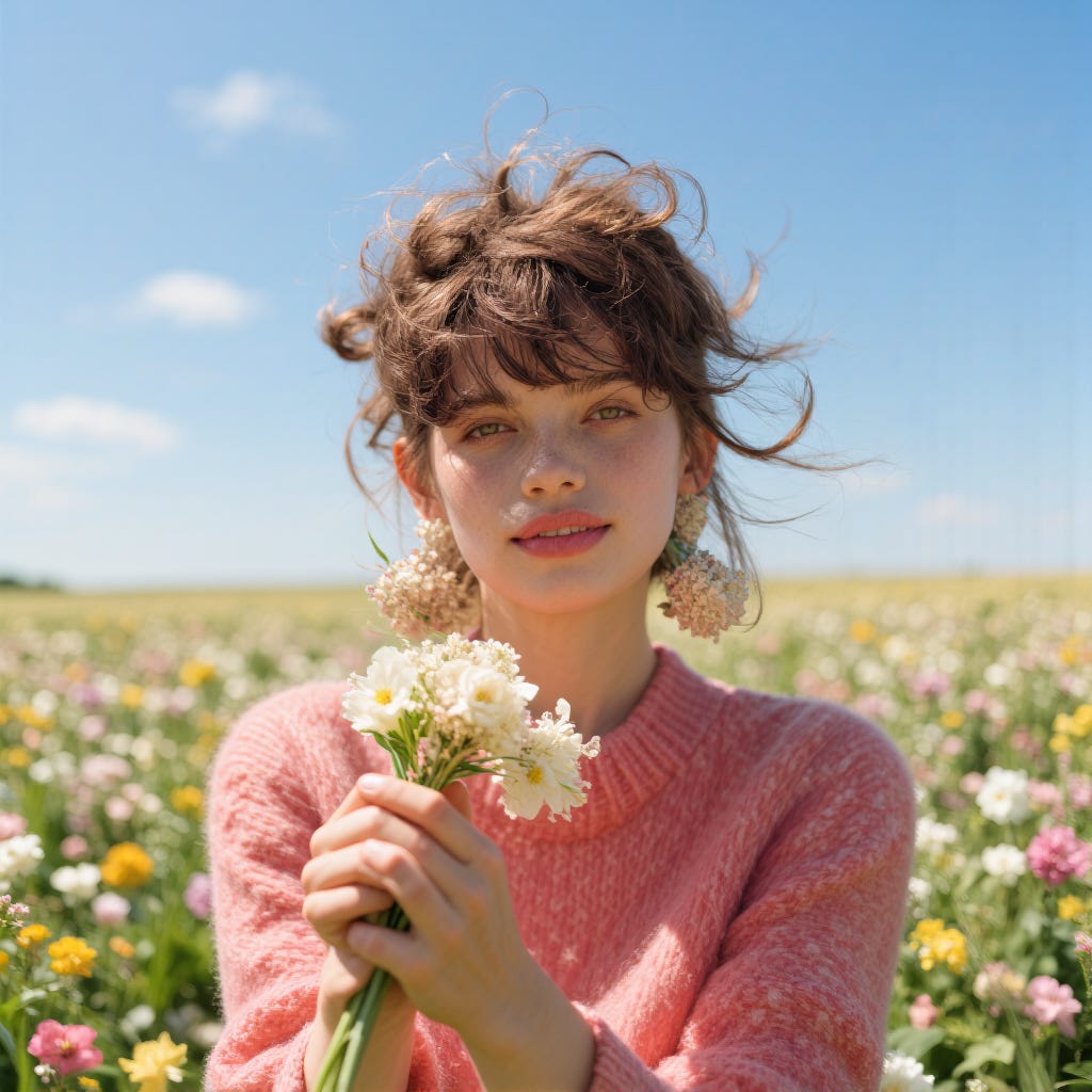 Prompt: A European girl with a heartfelt smile, her hands cradling a delicate bouquet. She is immersed in a vast, endless field of blooming flowers under a perfect summer sky.