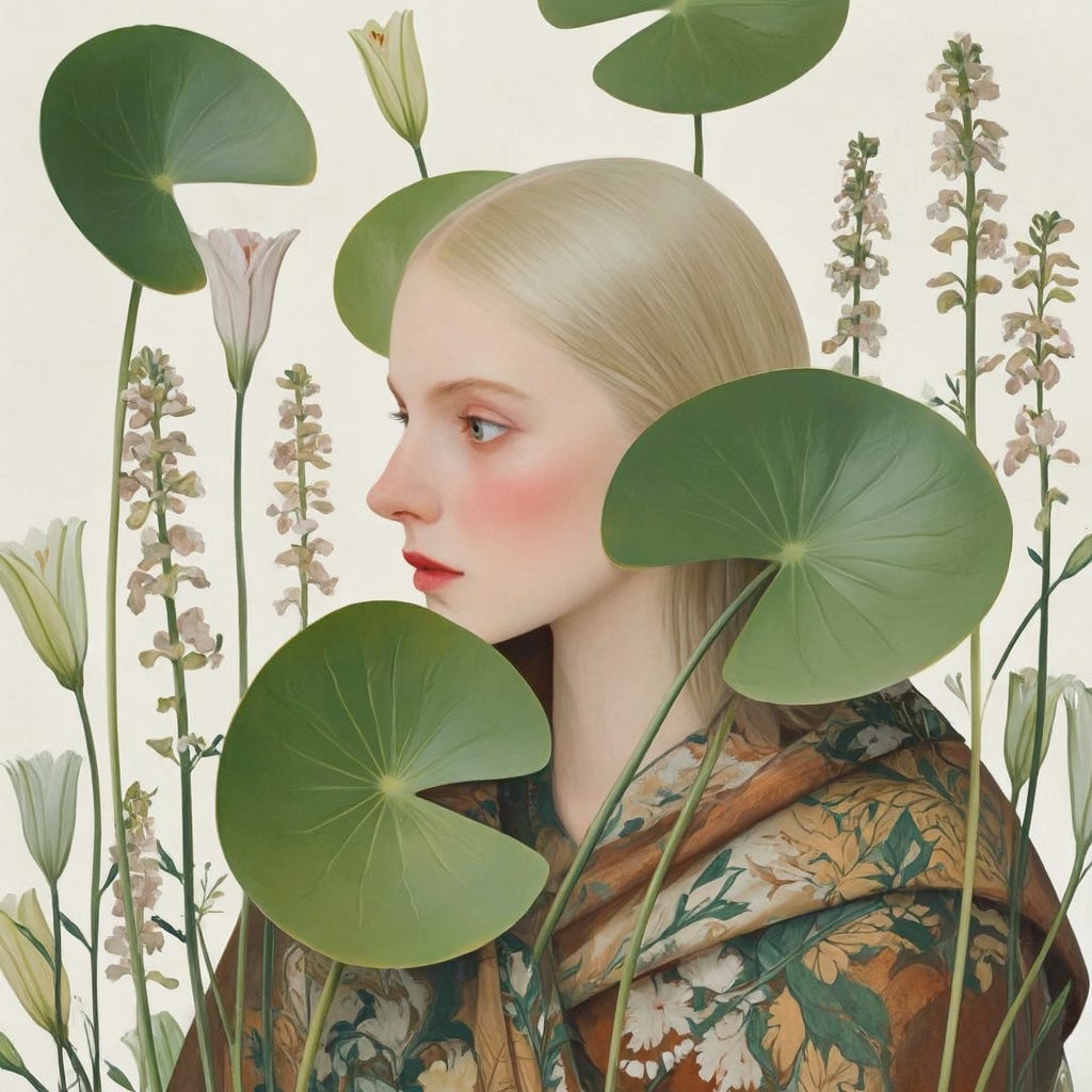 A contemplative portrait defined by a balanced, organic composition: the pale-haired woman’s gaze drifts softly to the left, her angular profile framed by oversized, stylized lily pads and tall, delicate blooms that fill the negative space, creating a gentle visual rhythm that anchors her figure to the natural elements. Her blush-kissed cheeks and the earthy, floral-patterned cloak blend seamlessly with the muted off-white backdrop, emphasizing the intimate, dreamlike harmony between the subject and her botanical surroundings.