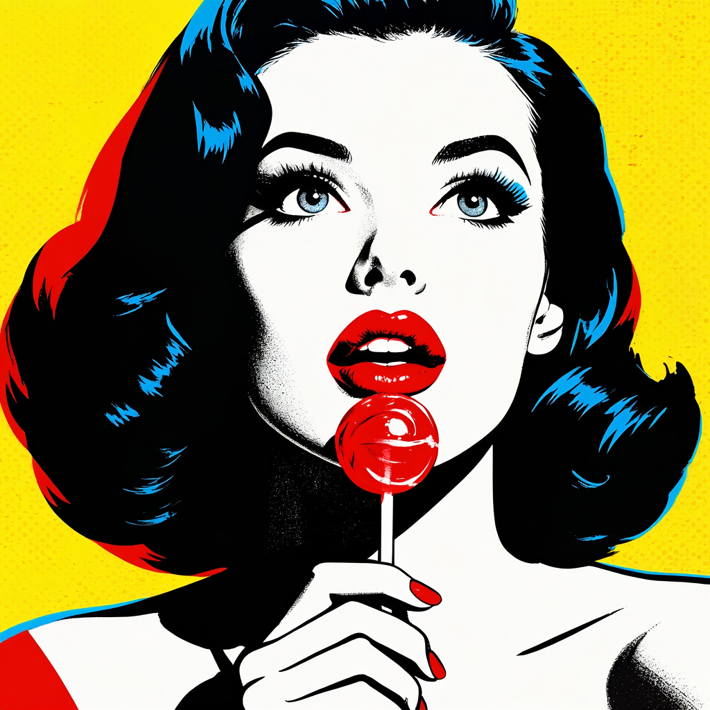 A bold pop art portrait: a woman with voluminous dark hair and vivid red lips holds a cherry-red lollipop, her wide, expressive eyes looking upward. The high-contrast, comic-book style uses sharp ink outlines, flat blocks of color, and a classic yellow halftone background, creating a vibrant, retro feel.