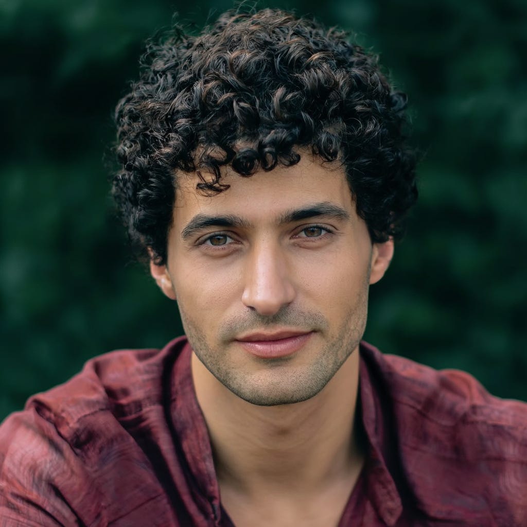 A close-up portrait shot. The Turkish man in the frame has thick, dark brown curly hair, with naturally curly strands that have a fluffy texture. His facial features are three-dimensional and deep-set, with light brown eyes looking calmly at the camera, soft lip color, and stubble on his chin with a natural textured feel. His overall demeanor is composed yet slightly gentle. He is wearing a wine-red textured shirt with folds, and the texture of the fabric shows delicate light and dark layers under the soft natural light. The background is blurred dark green vegetation. The low-saturation cool-toned background forms a harmonious contrast with the warm-toned skin and clothing colors. The entire image is bathed in natural and soft light, retaining the authentic texture of the portrait while exuding a serene atmosphere.