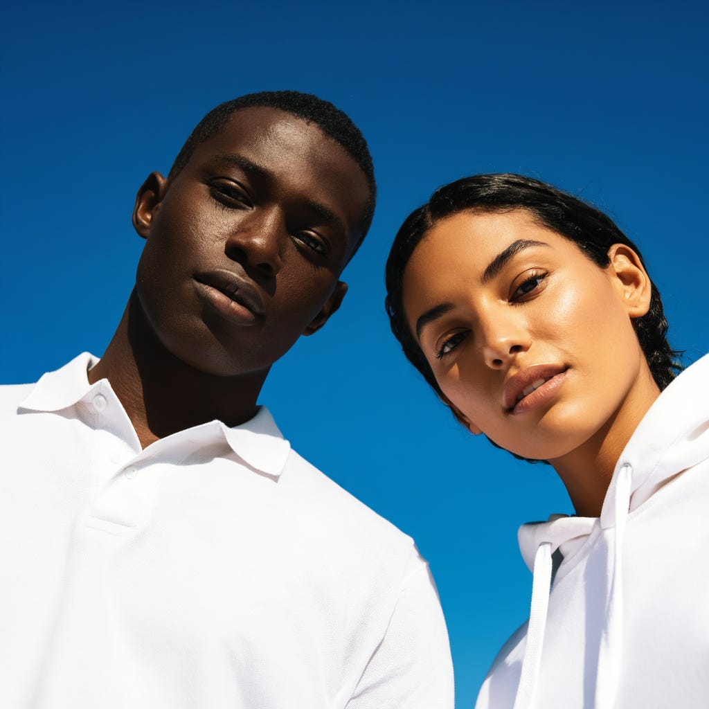 A low-angle, close-up fashion portrait featuring an African American man and a Latina woman standing side by side, leaning gently toward each other to create a natural visual focus. The high-saturation, crisp blue sky contrasts sharply with their all-white outfits—his textured polo shirt and her softly creased hoodie—while harsh midday sunlight casts sharp, defined shadows on their skin and clothing, adding depth and dimension. With relaxed, cool expressions and lazy gazes directed at the camera, the image blends vibrant street style with sophisticated visual appeal against the clean, vivid backdrop of sky and white.