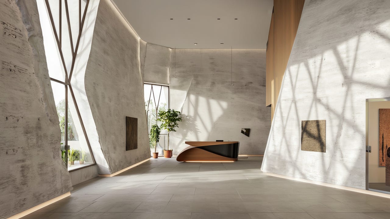 An office lobby in the style of Álvaro Siza. The space features clean, simple lines with a sense of fluidity. The walls are made of textured, light - colored concrete, perhaps with a slightly rough finish that gives an organic feel. There are large, irregularly - shaped windows that allow natural light to filter in at interesting angles, casting geometric shadows on the floor. The floor is composed of large, monochromatic tiles, either in a light gray or beige. In the center, there’s a unique, sculptural reception desk crafted from a combination of wood and metal, with smooth curves that echo the overall organic design. Along the walls, there are a few pieces of modern art, simple in form but rich in expression. Some potted plants add a touch of greenery, bringing life to the space, and the lighting fixtures are minimalistic, providing soft, ambient illumination.