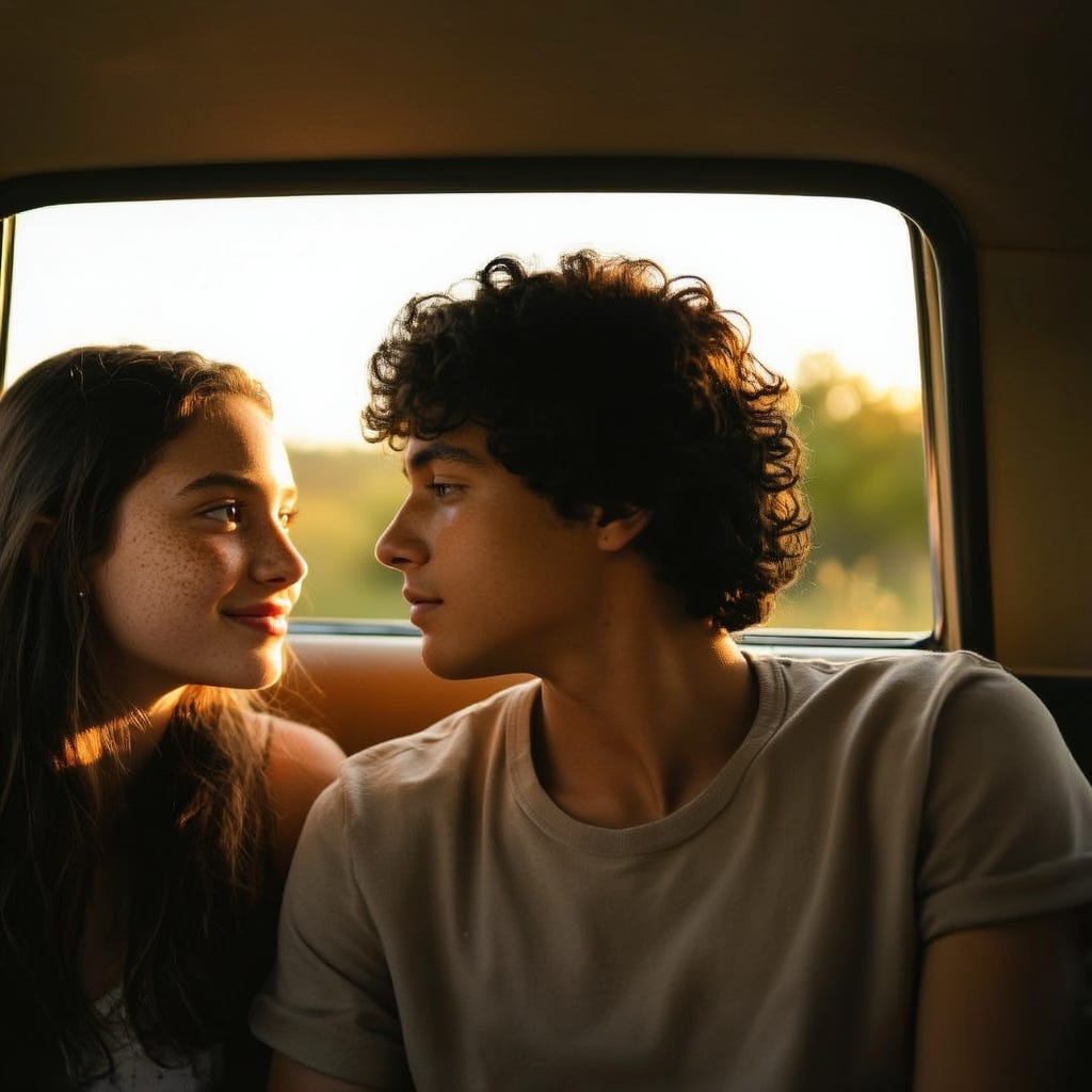 A retro film photograph with soft grainy texture and warm golden sunset tones freezes a romantic road trip moment: a young Latino couple sits in the front of a vintage car, the girl with freckled cheeks glowing delicately in backlight turns sideways to the boy with a gentle smile and affectionate eyes, he gazes intently at her in half-profile, his dark curly hair with a soft velvety finish in the warm light; sun-dyed golden suburban vegetation blurs outside the window, hazy greenery echoing the car’s warm glow, the whole scene in low-saturation warm brown and light gold exuding the lazy, loving vibe of a summer dusk.