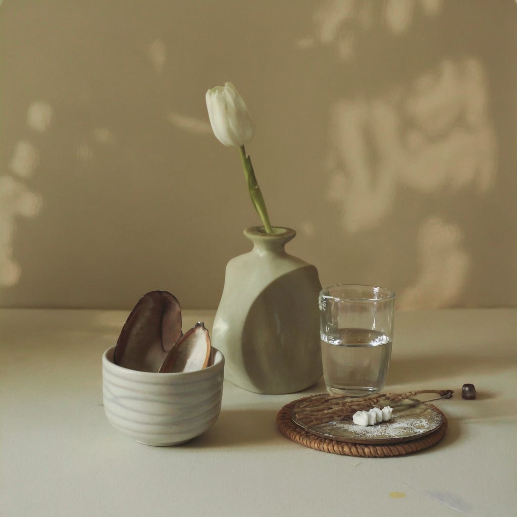 A poetic still life of everyday objects arranged naturally. Soft ambient light, imperfect shadows. Muted warm tones, subtle film grain. Editorial art photography style.