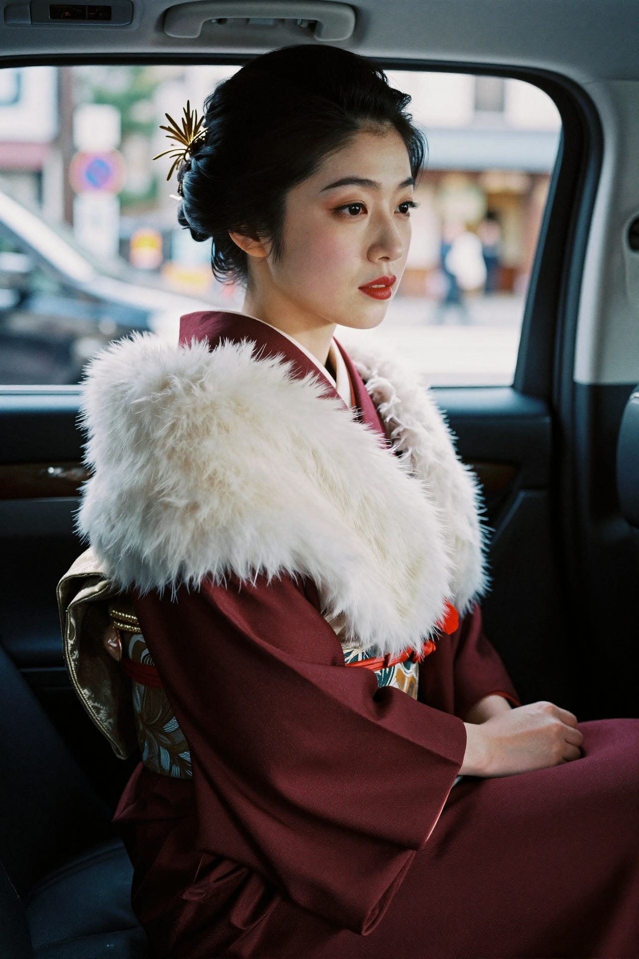 Japanese photography portrait of a beautiful Japanese woman with an elegant updo hairstyle, looking over her shoulder in the back of a car, wearing a stunning burgundy red kimono with a white fur shawl and a gold feather hair accessory, emotional and moody cinematic lighting with dramatic shadows, city street visible through the window, shot on 35mm film, analog style, film grain
