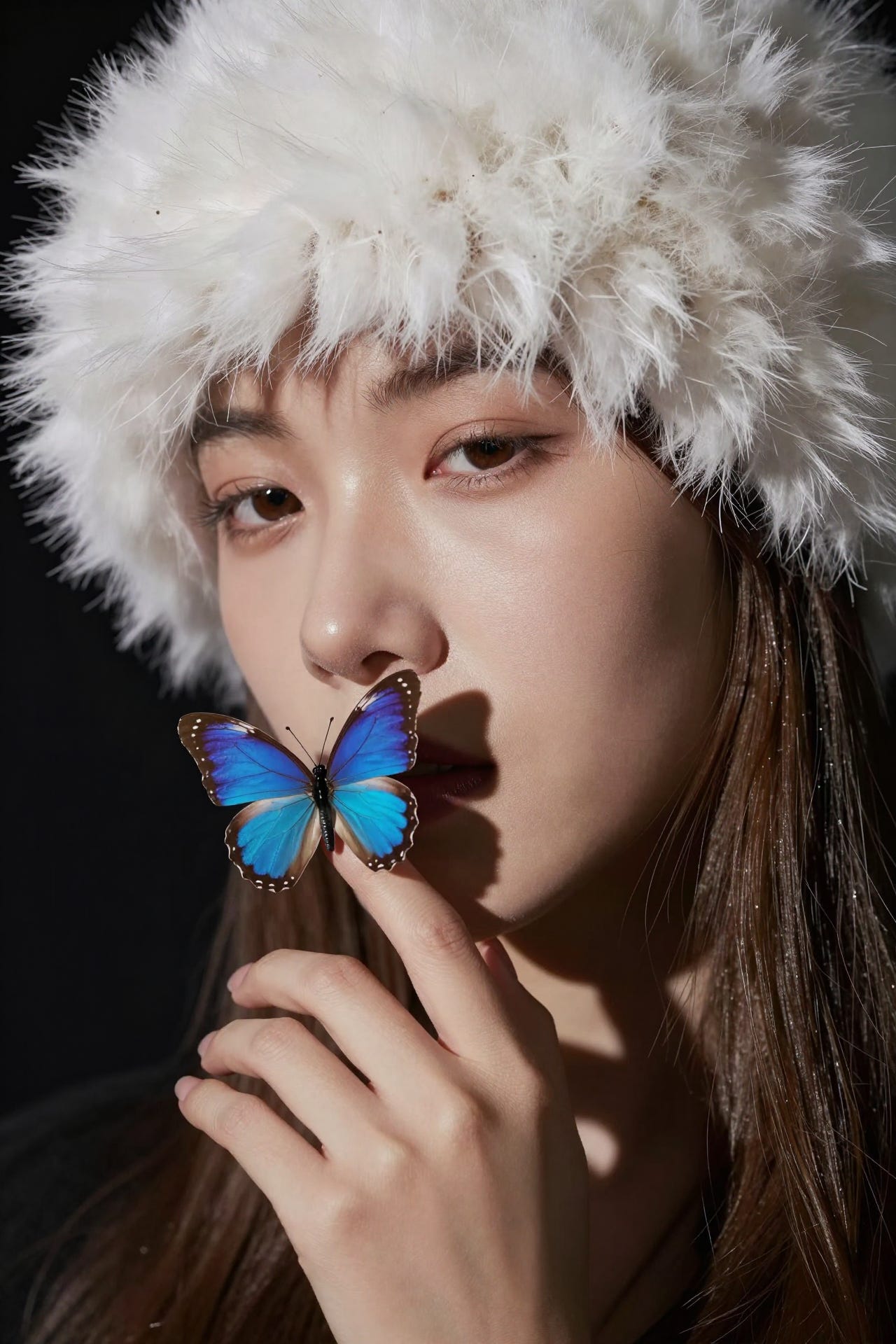 Photorealistic close-up portrait of a beautiful woman wearing a white fur hat, a vibrant blue butterfly perches on her finger, dramatic side lighting with strong highlights and deep shadows, cinematic, ultra-realistic.